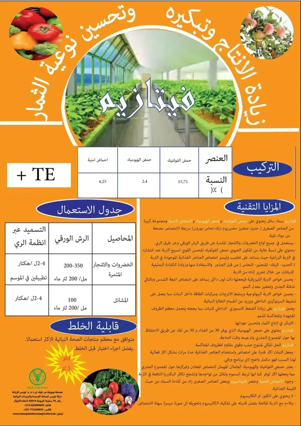 | الخضروات والأشجار المثمرة | 200-350 مل / 200 لتر ماء | تطبيقين في الموسم |