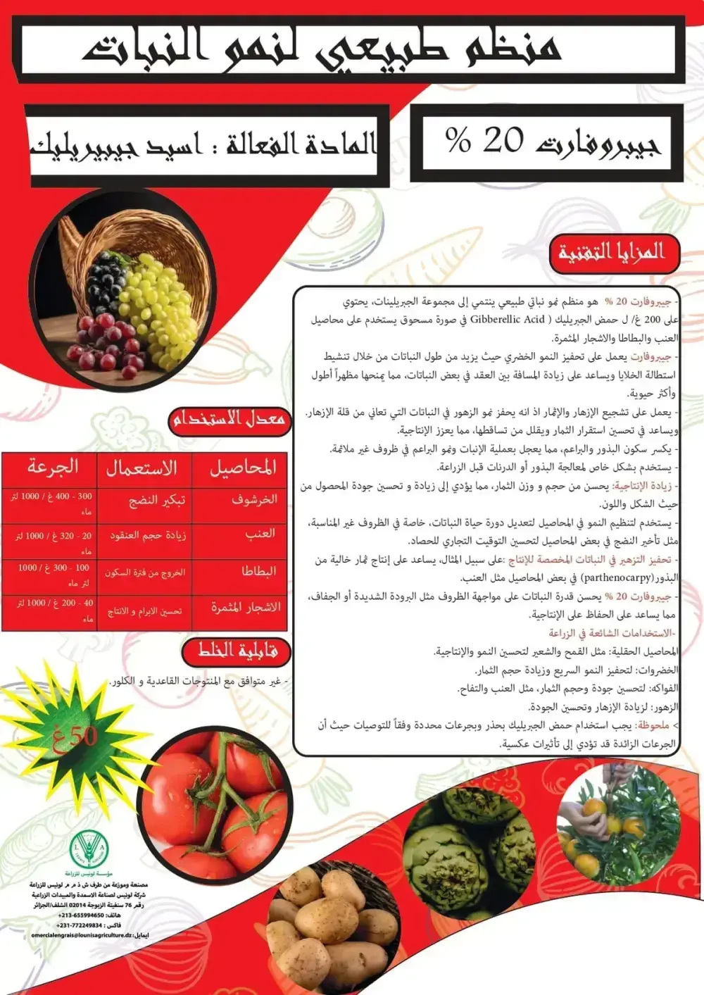 منظم نمو طبيعي قوي يعتمد على حمض الجبريليك النقي (20%)، مخصص لتحفيز الاستطالة الخلوية والنمو الخضري وتسريع الإنبات.