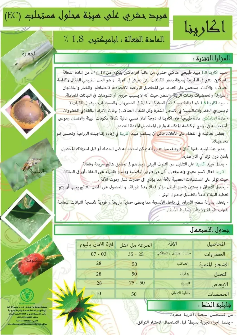 مبيد حشري عناكبي طبيعي من عائلة أفيرمكتين. يتميز بخاصية النفاذ السريع داخل الأوراق وتأثيره الممتد الذي لا يتأثر بالأمطار.