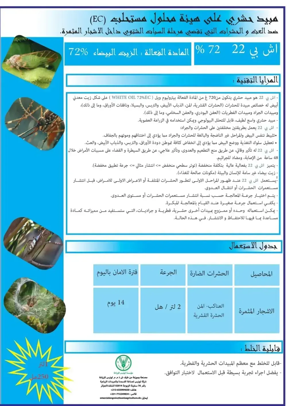 مبيد طبيعي واسع الطيف (حشري وفطري) مركب من زيت معدني أبيض. قابل للتحلل البيولوجي وصالح للاستخدام العضوي كعلاج وقائي ومادة مقضية للأطوار الشتوية للحشرات.